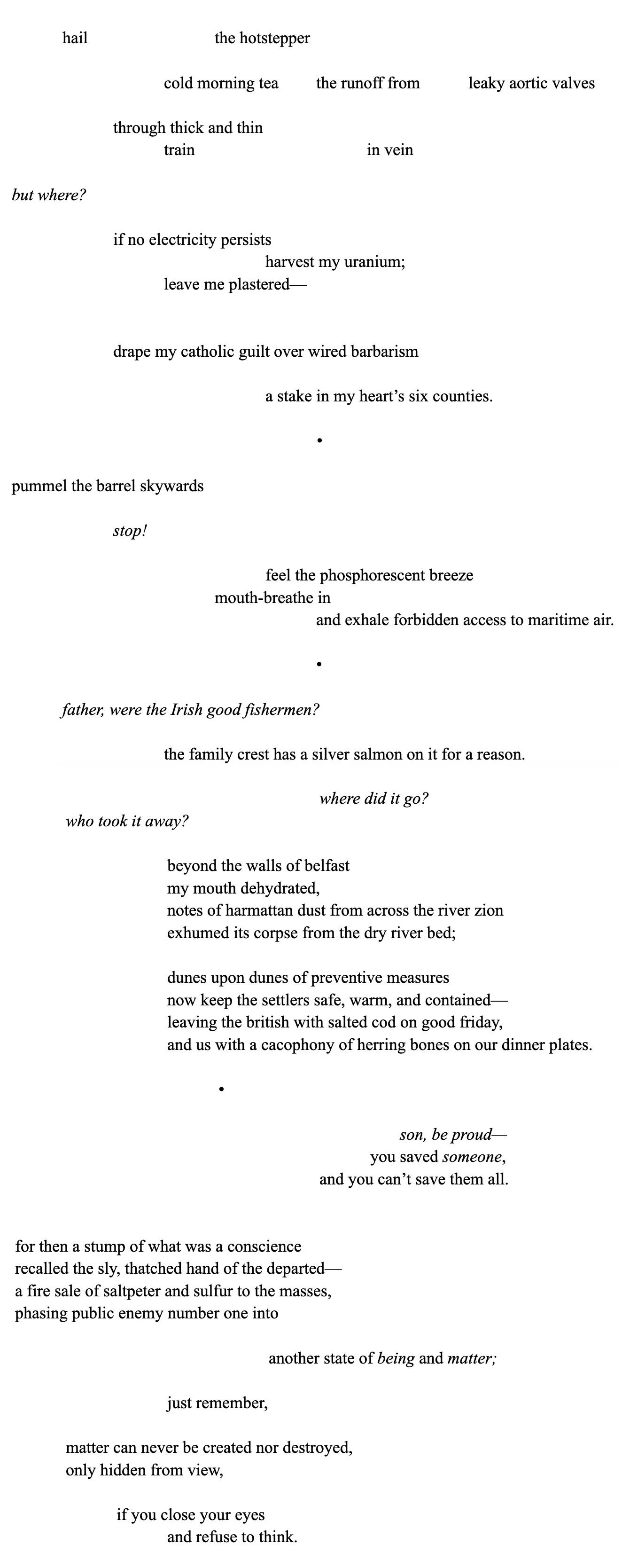 Alex O'Neill is a queer poet from Tiohtià:ke/Montreal. His work has most recently appeared in McGill University's International Relations Review and LBRNTH. Fond of foreign policy and shinrin yoku, Alex is currently editing a monograph on reggae music and Rastafari spirituality with a large academic press.